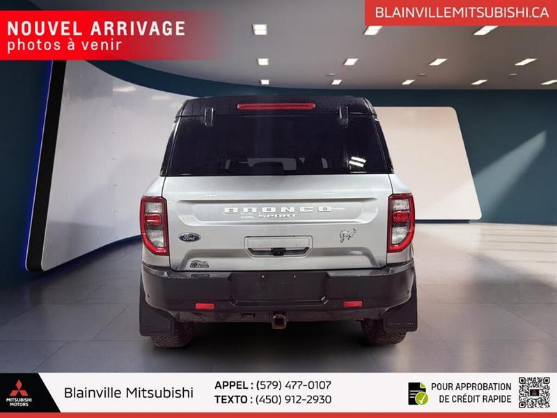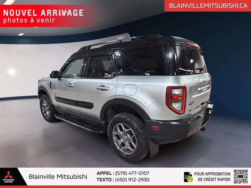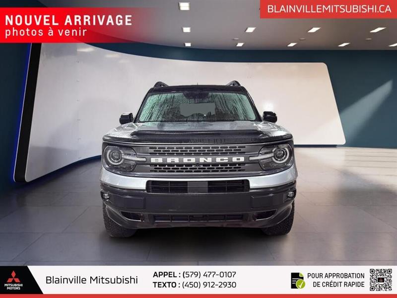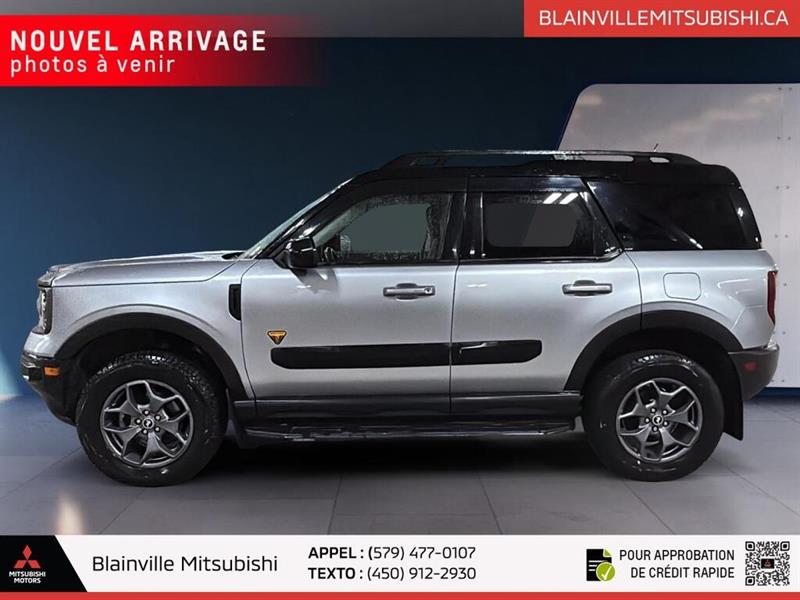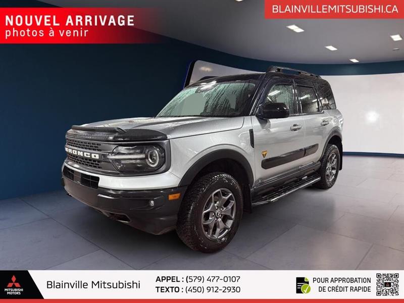 // EXCELLENTE CONDITION! // Ce Ford Bronco Sport Badlands 4x4 2022 usagé en gris propose une configuration 4 portes, une transmission automatique à 8 vitesses et un moteur 2,0 litres sans plomb. Avec 151 213 km à l'odomètre, ce VUS se démarque par sa traction intégrale, ses pneus hors-route et son équipement utile au quotidien. CARACTÉRISTIQUES DU Bronco Sport Badlands 4x4 »» Moteur 2,0 litres turbocompressé de 250 chevaux »» Traction intégrale 4x4 avec différentiel à glissement limité »» Transmission automatique à 8 rapports »» Pneus hors-route et crochet de remorquage arrière CARACTÉRISTIQUES DE SÉCURITÉ AVANCÉES »» Avertissement de sortie de voie inclus »» Surveillance des angles morts intégrée »» Caméra de recul pour manoeuvres précises »» Contrôle de stabilité et freins ABS PERFORMANCE ET EFFICACITÉ »» Moteur 2,0 litres sans plomb »» Transmission automatique à 8 vitesses »» Traction intégrale 4x4 pour adhérence accrue »» Différentiel à glissement limité ajouté CONFORT »» Sièges avant chauffants pour l'hiver »» Siège conducteur à réglage électrique »» Climatisation avant avec réglage automatique »» Volant réglable avec commandes audio TECHNOLOGIE ET CONNECTIVITÉ »» Intégration Bluetooth pour appels et audio »» Point d'accès WiFi à bord »» Radio satellite incluse »» Démarrage par bouton-poussoir pratique ESPACE DE CHARGEMENT »» Configuration 4 portes pratique au quotidien »» Accès au coffre arrière facilité »» Banquette arrière rabattable pour objets longs »» Pneu de secours inclus à bord RÉCOMPENSES ET RECONNAISSANCES »» Choix sécurité 2022, Insurance Institute for Highway Safety APPRÉCIÉ DES AUTRES PROPRIÉTAIRES »» Format maniable en ville et route »» Bonne motricité sur chaussée difficile »» Position de conduite appréciée au quotidien »» Commandes simples et faciles à utiliser GARANTIE »» Garantie légale seulement »» Garantie d'usage »» Garantie de durée raisonnable »» Garantie contre les vices cachés Ce Ford Bronco Sport Badlands 4x4 2022 offert chez Blainville Mitsubishi combine une mécanique plus robuste, un rouage intégral 4x4 et des équipements recherchés comme les sièges avant chauffants, les rétroviseurs chauffants, les phares à DEL et la surveillance des angles morts. Il convient autant aux trajets quotidiens qu'aux sorties de fin de semaine. Son aménagement met l'accent sur l'usage réel avec vitres électriques, rétroviseurs électriques, verrouillage automatique des portes, dégivreur de vitre arrière, phares automatiques et antibrouillards. Le volant en cuir, le support lombaire du siège conducteur et le rétroviseur intérieur électrochromatique ajoutent un niveau de confort appréciable. Ce VUS propose aussi des éléments pratiques pour la conduite d'ici, comme la surveillance de la pression des pneus, les serrures de sécurité enfant, les coussins gonflables latéraux et latéraux de tête, ainsi qu'un capteur de présence passager pour le coussin gonflable. L'ensemble reste cohérent, utile et bien adapté au climat québécois. Affiché en excellente condition, ce Ford Bronco Sport Badlands 4x4 2022 présente une combinaison intéressante de capacités, d'équipement et de polyvalence. Sa présentation soignée, son moteur 2,0 litres, sa transmission automatique et son rouage intégral en font un choix sérieux pour l'acheteur qui veut un VUS usagé bien équipé à Blainville. // EXCELLENT CONDITION! // Meet the 2022 Ford Bronco Sport Badlands 4x4, a compact SUV built for daily comfort and real adventure. Finished in Grey with 4 doors, this used model at Blainville Mitsubishi pairs rugged ability with smart features. Its 2.0 L unleaded engine and 8-speed automatic transmission deliver confident power on every trip. With 151,213 km, this 2022 Ford Bronco Sport Badlands 4x4 still offers the toughness and versatility drivers expect from Ford. Four-wheel drive, off-road tires, a rear tow hook, and a limited slip differential help it stay composed on rough roads, while modern safety and comfort features make every drive easier. FEATURES OF THE Bronco Sport Badlands 4x4 »» 2.0 L turbocharged four-cylinder engine »» Advanced 4WD for added traction »» Off-road tires for rough terrain »» Rear tow hook for utility ADVANCED SAFETY FEATURES »» Backup camera helps with safer reversing »» Blind spot monitor adds lane awareness »» Lane departure warning supports safer travel »» Multiple airbags help protect occupants PERFORMANCE AND EFFICIENCY »» 2.0 L engine delivers strong output »» 8-speed automatic shifts smoothly and quickly »» Four-wheel drive boosts all-weather confidence »» Limited slip differential improves traction COMFORT AND CONVENIENCE »» Heated front seats add winter comfort »» Automatic climate control keeps cabin pleasant »» Driver's power seat adds easy adjustment »» Cruise control supports relaxed highway driving TECHNONOLGY AND CONNECTIVITY »» Bluetooth integration supports hands-free calling »» WiFi hotspot keeps devices connected »» Satellite radio expands entertainment choices »» Steering wheel audio controls add ease CARGO SPACE »» Rear trunk access makes loading simple »» Four-door layout improves daily practicality »» Spare tire adds peace of mind »» Flexible SUV shape suits active lifestyles AWARDS & RECOGNITIONS »» Top Safety Pick, Insurance Institute for Highway Safety, 2022 WHAT OTHER OWNERS LIKE »» Strong turbo power for everyday driving »» Confident ride on rougher road surfaces »» Useful cargo room for gear »» Easy-to-use controls and connectivity This Ford stands out with practical equipment that matters every day. Heated mirrors, electric mirrors, power windows, tinted windows, automatic headlights, LED headlamps, fog lights, rear window defroster, and automatic door locks all help make driving easier in changing Canadian weather. Inside, the cabi